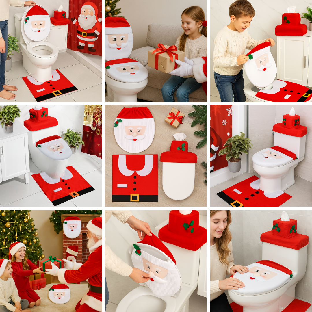 Santa Toilet Seat™ 4-piece handmade set includes a lid cover, tank cover, rug, and tissue box holder. Soft, reusable, and hilariously festive, it’s holiday humor wrapped in cozy fabric.